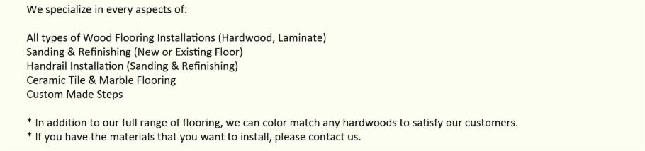 Hardwood / Laminate Marble / Ceramic Tile Sanding & Refinishing Custom Made Steps Contact us by E-mail .